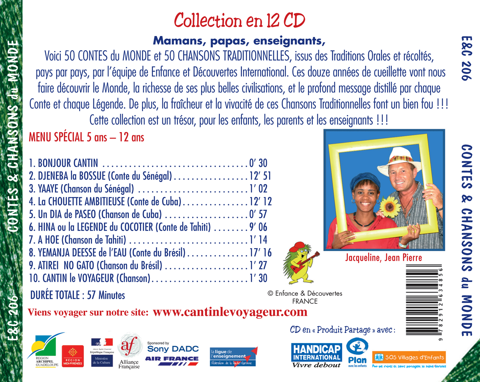 Album interactif pour les 5-6 ans jusqu’à 12 ans et beaucoup plus…Nous partons en compagnie de Cantin le Voyageur au Sénégal, à Cuba, à Tahiti, au Brésil. Tout ceci en Contes et Chansons