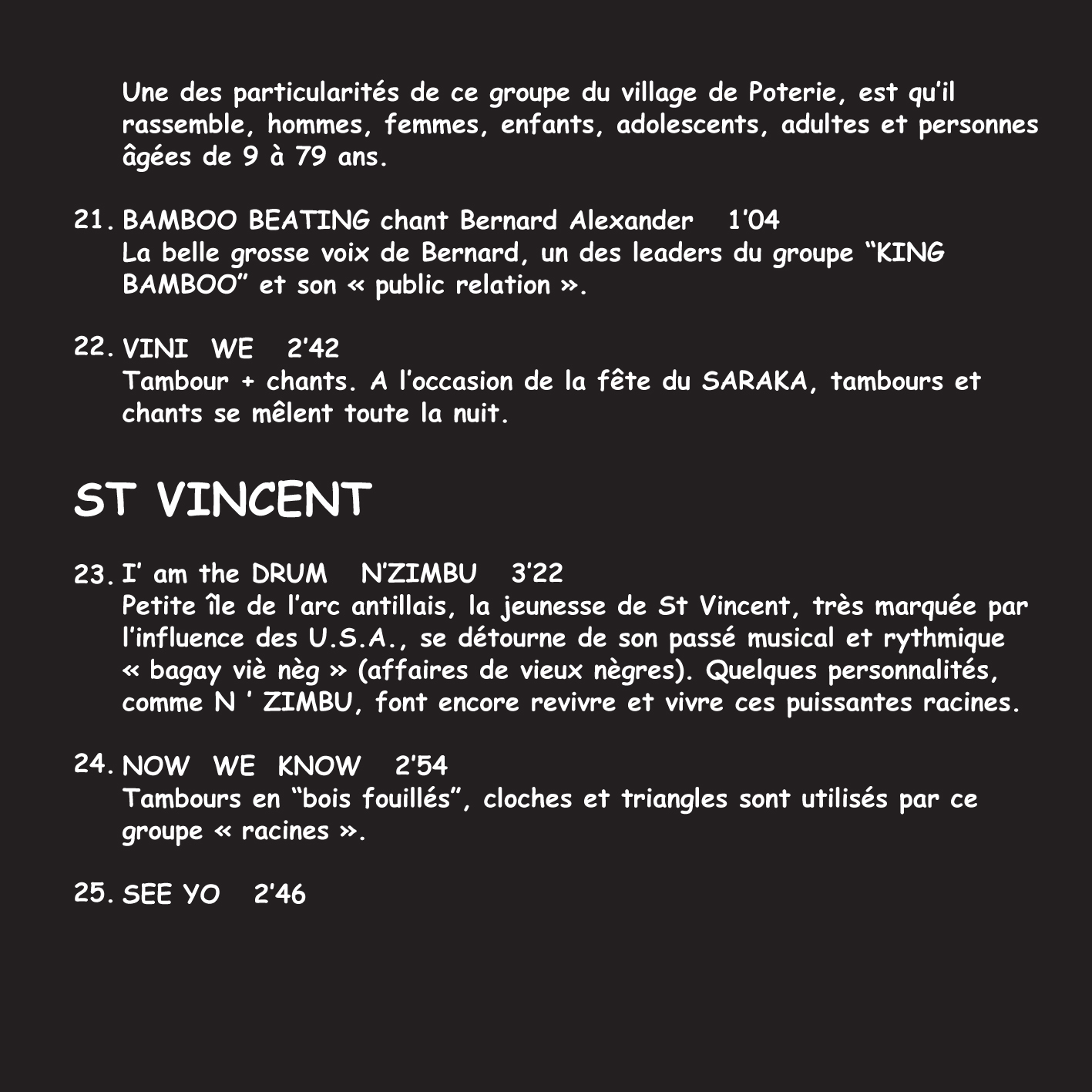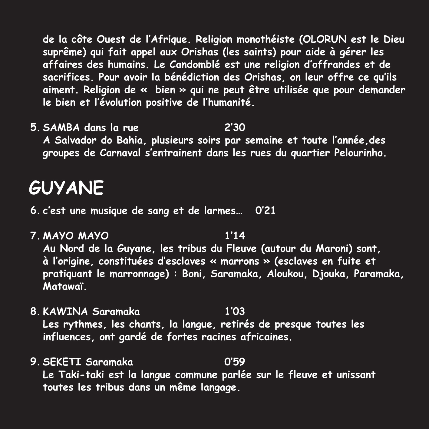 Nous allons, ensemble, voyager aux RACINES de ces MUSIQUES arrivées d’AFRIQUE avec les esclaves ! Ces femmes et ses hommes ont fait renaitre leurs musiques ancestrales. Le plus souvent en secret et sans instruments. Quelque fois, un mélange s’est opéré entre ce qui existait sur place et ces rythmes et chants importés. Vous remarquerez que d’un pays, ou d’une Île à l’autre, pourtant très proches, les rythmes et les chants sont souvent très différents. C’est ce qui fait toute la richesse et la grande force de ce travail de récolte et de sauvegarde.